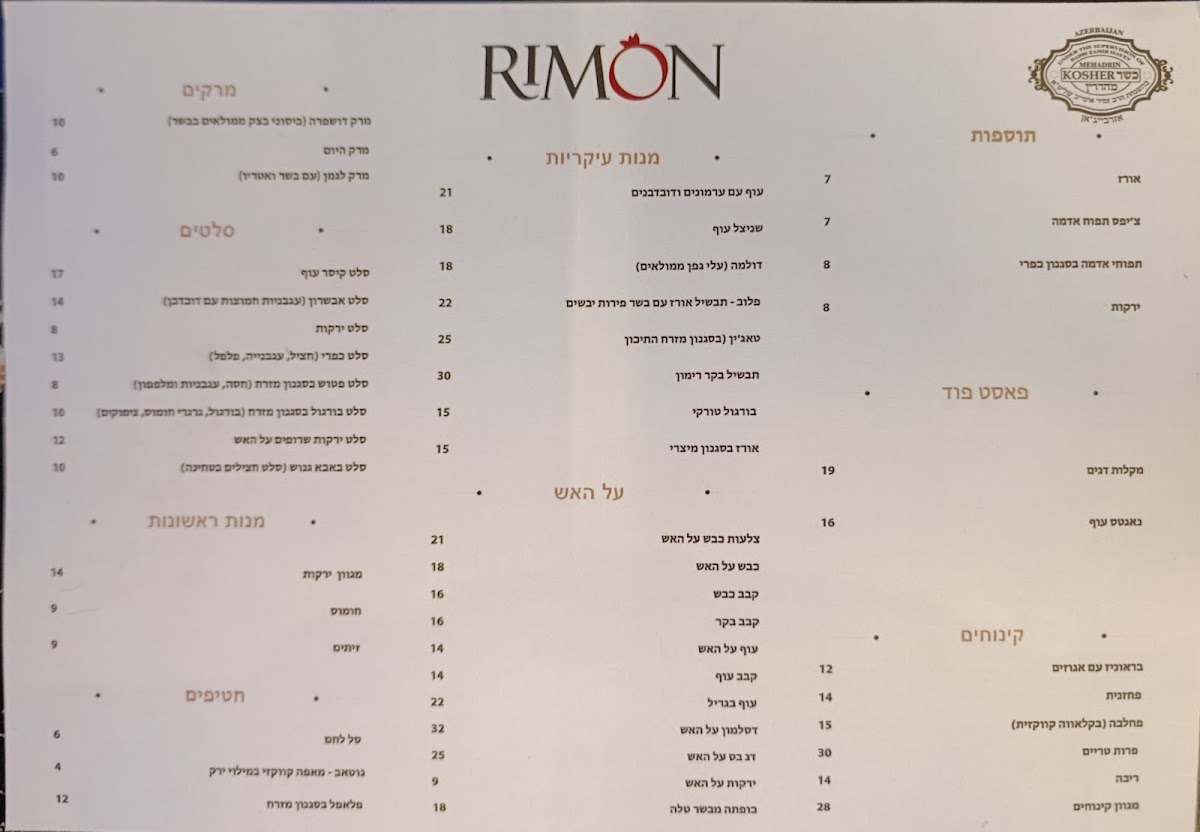 Welcome to Rimon Kosher Restaurant, a vibrant culinary gem located at 74 Uzeyir Hajibeyov in Baku, Azerbaijan. The menu here is a delightful fusion of traditional Jewish and Azerbaijani flavors, ensuring a unique dining experience for all.